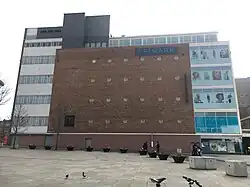 The architectural theme around which most buildings in Coventry's post-war shopping precinct were based was set in 1948 by Donald Gibson's design for Broadgate House. It is a brick-clad building with regularly spaced windows edged with white stone, and an arcade at street level supported by stone-clad columns.[15] The brick chosen is a similar colour to the local red-grey sandstone, allowing the new buildings to sit less jarringly next to the old. Hotel Leofric and the buildings in the Upper Precinct all follow this general pattern with small variations.[16] The Owen Owen Building departed from this theme, its concrete mushroom column construction allowing the creation of a five storey glazed curtain wall facing out onto Broadgate.[17]