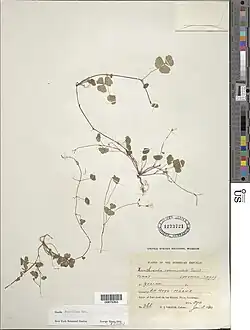 It was first described in 1912 by German entomologist, Ignatz Urban as Oxalis domingensis.[7] However, in 1943, its status as a separate species was rescinded and considered to be a variety of Oxalis corniculata – i.e.: Oxalis corniculata var. domingensis.[8][9] Since 2012, it has been restored back to its previous status of being a separate species.[2]