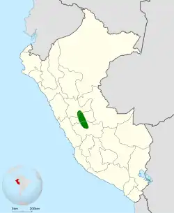 The Oxapampa antpitta is endemic to the eastern slope of the Peruvian Andes from the Huallaga River in Huánaco Department south through Pasco Department into Junín Department north of the Mantaro River. This last separates it from the closely related Ayacucho antpitta (G. ayacuchensis). The species' habitat preferences are not fully known but appear to be the same as those of its former conspecific chestnut antpitta. That species inhabits the understory of humid montane forest and secondary forest where it favors stands of bamboo and other dense undergrowth. In elevation the Oxapampa antpitta occurs between 2,400 and 2,700 m (7,900 and 8,900 ft).[3][8][9][10]