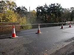 On 5 November 2010, at about 3:30 pm, a concrete mixer lorry fell off the bridge over the railway 50 metres north-east of the station, and landed on carriages of a train accelerating away from the station.[3] No-one was killed. Witnesses stated that the rear of the lorry crashed through the parapet of the bridge and dragged the whole vehicle over the side of the bridge.[4] The eight-carriage train, operated by South West Trains, was working the 15:05 Guildford to London Waterloo.[3] The train was formed of two Class 455 electric multiple units. The lorry, loaded with concrete and weighing 24 tonnes, landed on the sixth carriage, severely crushing the end of the roof.[5] Further damage was sustained by the fifth, seventh and eighth carriages, with the last of these being derailed at its trailing bogie, although the train remained upright.[5] British Transport Police reported that six people on board the train sustained minor injuries, whilst the driver of the lorry had sustained more serious injuries.[3] This was later revised to two serious and five minor injuries.[5] The Class 455 electric multiple unit involved has since been fully repaired using a rebuilt carriage from a Class 210 diesel multiple unit and returned to service in July 2013.