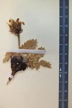 Oxytropis urumovii is distinctive compared to the other Balkan species of Oxytropis, with a semi-bilocular or almost completely bilocular legume. The plant, including the fruit, is densely covered with 2–3 mm patent whitish hairs. Amongst the European species of Oxytropis, Oxytropis urumovii is diagnosed by being acaulescent, having leaves with about eight pairs of leaflets, calyx-teeth which are much shorter than the tube, yellowish flowers and an ovoid semi-bilocular legume.[2] It is distinguished from the more widespread Oxytropis campestris, with which it shares the same habitat, by the much longer, denser and generally patent indumentum.[2]