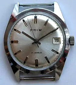 In 1949, the subsidiary of company Chronotechna Šternberk was established in Nové Město nad Metují, specializing in the production of personal watches (wristwatches and pocket watches). The first prototype watches were made in 1954 and were marked 'Spartak', the 'PRIM' brand was registered in 1956, the serial production started in 1957, thus Czechoslovakia has become one of only twelve countries in the world capable of producing wrist watches.[1] It was the only manufacturer of watches in Czechoslovakia, reaching about half a million watches produced annually just before the Velvet Revolution.[2][3]