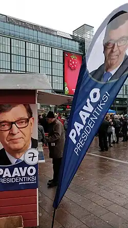 Väyrynen had been polling third or second in opinion polls for the election after Sauli Niinistö. He was also accusing other candidates of hiding their positive attitude of possible Finnish membership in NATO. He has also suggested that Finland ought to readopt the Finnish markka alongside the euro.[15] Väyrynen was eliminated from the second round of the election (5 February), placing third on the first round (22 January) behind the Green League's Pekka Haavisto by a close margin of 1.3% (37,000 votes).[16]