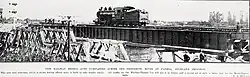Minister of Public Works, Bob Semple, turned the first sod on 27 January 1938 at Paeroa[19] and about 32 mi (51 km) of the 42 mi (68 km) line had been started[20] when work was abandoned in 1940.[21] Work was still making slow progress in 1950, when a paragraph in the Ministry of Works annual report said 20 private crossings had been formed and metaled and 456 ft (139 m) of culverts installed.[22] In 1954 it was noted the major cost would be a £3100, 30 ft (9.1 m) bridge across the Waihou, the abutments already being in place.[3] Most of the work was still in place in the 1960s.[23]