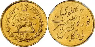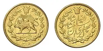 The "Pahlavi Coins" (Persian: سکه پهلوی) were the official gold coins of Iran from 1926 to 1979, and the term "Pahlavi" is the currency of these coins.[1] These coins replaced the Qajar Toman gold coins when Reza Shah Pahlavi came to power in 1925 and the monetary system changed in 1926.[2] After the 1979 Revolution in Iran the name of these coins was changed to "Bahar Azadi".