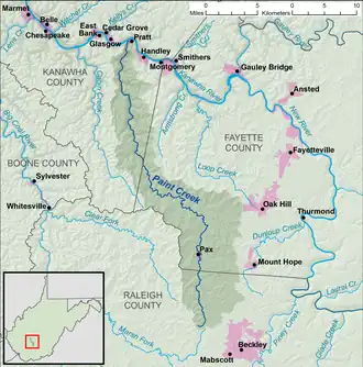 Paint Creek rises in north central Raleigh County and flows along County Route 7 north through Sweeneyburg and Maynor. At Maynor, the creek continues north along the West Virginia Turnpike.[5] The creek follows the turnpike north into Fayette County, where it runs through the communities of Willis Branch, Pax, Long Branch, and Lively before curving to the northwest. Past Mossy and East Kingston, the creek briefly turns away from the highway before following it through Westerly, Milburn, Coalfield, Mahan, and Collinsdale.[6] The creek then enters Kanawha County, where it heads north through Burnwell, Greencastle, and Whittaker. At Standard, Paint Creek Road turns away from the turnpike to follow County Route 83 (Paint Creek Road) north through Livingston and Gallagher.[7] The creek flows north through Hollygrove before reaching its mouth at the Kanawha River in Hansford.[8]