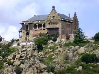 The palace was built between 1920 and 1922 for Abárzuza, Conde de las Almenas III.[1] It is located on the peak of a granite mountain 1,011 metres above sea level. It covers 100 acres. Parts of it remain carved into the rock, such as stairs and balconies.[2]