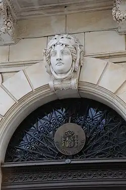 The two bodies to the northeast, include doorway with rounded arch, while some window plinths are decorated with a head of a woman, with the mask of a lion, while the royal arms of Spain appear on the extreme northeast body.[1] These are surmounted, respectively, by windows decorated in founded frontispiece, supported by anthropomorphic ledges, and served by a varanda an balustrade with plinths.[1]