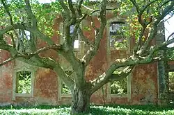 The red-tinged walls of the eastern facade remained after the fire that engulfed the palacete