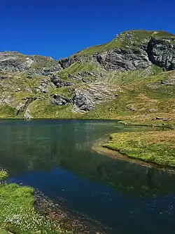 This area consists of several lakes, all of which were formed through glacial excavation: Lac Long (2,720 m (8,920 ft), located below the Bussola Pass, French for "Long lake"); Lac Potcha (2,518 m (8,261 ft)), which is located at the foot of the Palasinaz hill. The view from the Lac Potcha is wider than the view from the other lakes due to its higher altitude; Lac du Couloir (2,606 m (8,550 ft), French of "Corridor Lake"), whose waters, together with those of Lac Vert (2,485 m (8,153 ft), French for "Green Lake"), flow into the Lac de la Bataille (2,485 m (8,153 ft), French for "Lake of the Battle"). This last lake is the largest of the group and is characterized by a trapezoidal shape and a large promontory that almost divides the entire lake in two.[1] The Lac du Couloir (2,606 m [8,550 ft]) is located in a small glacial excavation basin.[2]