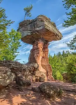 Natural monuments like Teufelstisch (Devil's Table) here, can be experienced throughout the region. They are outcroppings of bunter sandstone, strangely shaped by millennia of slow erosion