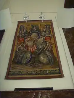 The interior uses fine marbles from across Italy, including green serpentine marble of the Alps, fish-veined marble, white Carrara marble, red Levanto marble, pink Castelpoggio marble, and the multicolored-veined Arni marble. The main salon is ten meters high, and illuminated through a glass mosaic curtain, which derives light through alabaster slabs. In this hall, known as the presidential hall, are hung four tapestries that including ominous depictions ancient and modern militaristic themes, including two facing works, one depicting ancient Roman armor, fasces, and eagle standards, and the other, a collection of modern armaments. The stucco decorations on the piano nobile (first floor) depict an episode of the siege of Florence, designed by Mario Moschi, and the construction of the dome by Brunelleschi, designed by Giannetto Mannucci.[2][3][4]