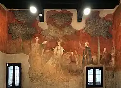 When the restoration of Casa Borromeo took place in the 1950s under the direction of architect and archaeologist Ferdinando Reggiori, a number of fresco decorations were found inside the palazzina. Recovered fragments of paintings in the Sala delle storie di Esopo (Room of Aesop's Fables), attributed to Lombard artist Michelino da Besozzo, were taken to another Borromeo residence, the Rocca di Angera. Three walls of frescoes (the fourth was destroyed in 1943) were found in good condition in a large hall now called the Sala dei Giochi Borromeo (Room of the Borromeo Games) and have remained in place. Representing the type of entertainment held by the Borromeo, they depict elegantly dressed ladies and gentlemen indulging in leisure-time activities in a beautiful garden; some play tarrocchi (tarot), others participate in a ball game, while a third group gracefully executes dance-like movements in the game of palma. The style and costumes date the paintings to the 1440s, but the painter is unknown. The frescoes have been attributed over the years to the foreign masters Pisanello and Masolino da Panicale, but most scholars believe they were executed by a Lombard artist; the Zavattari family, Cristoforo Moretti, Giovanni Zenone da Vaprio, and Michelino da Besozzo have all been suggested. The frescoes inspired similar decoration in other Lombard palaces.[12]