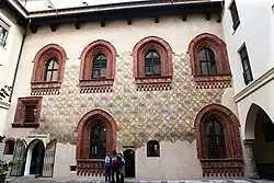 Also in Vitaliano's time, two courtyard wings were constructed behind the older building: the first, a small service court, was for horses, merchandise, and business transactions, while the second court, behind it, is larger and functioned as the formal entrance space to the house (cortile d'onore) for the family and their guests. The columns forming porticoes in the courtyards (severely damaged in 1943 and restored) are short and sturdy, carved from serizzo (a type of granite), with capitals of large, stylized leaves; they also carry pointed arches and echo the shape and proportion of the main portal. The inner courtyard is the part of the house that is best preserved; some of the original frescoes on the walls are still visible. In the courtyard itself, frescoes on the three walls above the porticoes were badly damaged. On the fourth side is a building called the palazzina (little palace), which fortunately retains most of its decoration. Six large arched windows and one small square window adorn its two-story facade, with elaborate terracotta frames characteristic of the period in Lombardy. The brick wall of the palazzina was plastered and painted with a colorful repeating pattern of a count's coronet, groups of rings (a heraldic motif), and the Borromeo motto, humilitas (humility).[10]