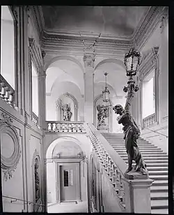 The interior courtyard has a monumental Baroque staircase designed in 1680 by Paolo Canali. The statuary at the top of the stairs is by Gabriele Bunelli. The ball room of the palace was frescoed (1684) with quadratura and Trompe-l'œil scenes by Francesco Galli Bibiena and other rooms were frescoed by Angelo Michele Colonna.[3] Part of the palace is now used for exhibitions.[4]