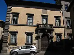 The prominent Monaldeschi family has various palaces in Central Italy, and exerted significant power in medieval Orvieto. Putatively Simone Mosca designed a palace circa 1570 for the Counts della Cervara, likely including this palace commissioned by Sforza Monaldeschi della Cervara.[1] The palaces was enlarged (1574-1575) after the reign of Pope Pius IV by Ippolito Scalza, who designed ten windows for the facade (1572) as well as some internal refurbishments. The Salone della Camminata was frescoed by Cesare Nebbia or a team under his guidance including Cesare and Vincenzo Conti, Giovanni Battista Lombardelli, and Angelo Righi. The colorfulquadro riportati with Trompe-l'œil architecture and statues depict the signs of the zodiac, the constellations, and also mythologic scenes including Amore and Psyche, Kronus, Apollo and Daphne, Icarus, and Astrea and Prometheus.[2][3] The central coat of arms was modified to add the black eagle symbol of the Marsciano.[4]