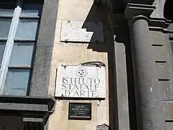 Over the centuries the palace has had various owners and uses. The Jesuits were temporarily housed here when they arrived in Orvieto in 1621. Orazio da Marsciano acquired the palace in the early 17th century, and it remained in his family for over 200 years. The Marsciano heraldic shield is sculpted above the main portal on Via Beato Angelico. Plaques along the door announce its prior and present roles as the Istituto Lazzarini and as an Institute of Art. At the end of the 19th century, it was acquired by the Salesians, using a donation from the Lazzarini family. In 1893, Pope Leo XIII approved its adaptation by Paolo Zampi to form the Collegio Leonino. The palace houses offices of the Istituto Statale d'Arte di Orvieto.[5][6]