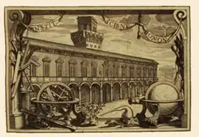 The Palazzo Poggi was built as the home of Alessandro Poggi and his brother the future Cardinal Giovanni Poggio.[1] The building was erected between 1549 and 1560.[2] The design of the Palazzo Poggi has been attributed to Bartolomeo Triachini.[3] He was apparently given the commission for the Palazzo Poggi by the Bishop Giovanni Poggi shortly before he was elevated to Cardinal.[4][a] Other sources attribute the design of the Palazzo Poggi to Pellegrino Tibaldi.[2] Cardinal Poggi met Pellegrino Tibaldi after the painter moved to Rome in 1547, and later commissioned him to paint the Palazzo Poggi.[6] Tibaldi, a native of Bologna, returned to the city in 1555 and painted frescos for the Cardinal in the palace and the family chapel. The frescoes are considered Tibaldi's masterpiece.[7]