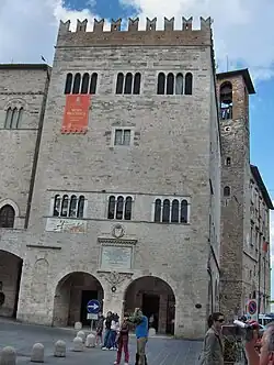 The palace was erected in 1213-1228, thus decades before the adjacent Palazzo del Capitano. The wide staircase that serves as a bridge into the main council room was added in 1267 by the Podestà Pandolfo Savelli. The orientation of the main facade was established in the 16th century. The palazzo was extensively refurbished in the 19th century, which added the merlons to the rooflines of two buildings in this piazza.[1][2]