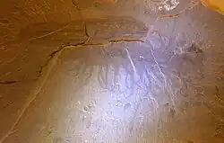 A putative red algae. It formed leaf-like lobes that measured around 25mm across. Only the sturdier parts of the skeleton are known.