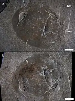18. ^ Moon, Justin; Caron, Jean-Bernard; Moysiuk, Joseph (2023-08-09). "A macroscopic free-swimming medusa from the middle Cambrian Burgess Shale". Proceedings of the Royal Society B: Biological Sciences. 290 (2004). doi:10.1098/rspb.2022.2490. ISSN 0962-8452. PMC 10394413. PMID 37528711.