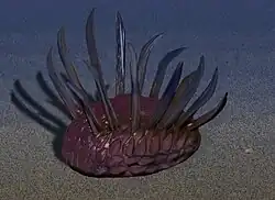 A soft bodied, disk shaped animal. Currently it is thought to have been a cambroernid, which is a group of basal ambulacrarians.