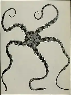 - SMNS 80234 (Stenopterygius quadriscissus) represents another female with embryos, yet also shows ribs broken perimortem that may represent either intraspecific aggression or a predation attempt. This specimen has several taxa associated: ammonite aptychi, two ophiuroids (Sinosura brodiei) and an articulated echinoid (Diademopsis crinifera) indicate a short-lived deadfall community.[8]