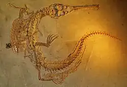 - Another specimen of Pachycormus macropterus preserves an ammonite inside its gut, likely swallowed by accident and directly responsible for the fish's death.[19]