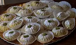 Ka'ak bi 'awja is a semolina shortbread pastry filled with ground dates called 'ajwa or walnuts. The dessert is a traditional meal for Christians during Easter,[40] however, ka'ak bi awja is also prepared towards the end of Ramadan, to be eaten during Eid al-Fitr—a Muslim festival immediately following Ramadan, as well as during Eid al-Adha.[30][41] During Mawlid—the holiday honoring the birth of the Islamic prophet Muhammad—Zalabieh which consists of small, crunchy deep fried dough balls in dipped in syrup, is served. The dough is made from flour, yeast and water.[40]