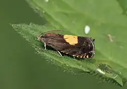 The wingspan is about 13–16 millimetres (0.51–0.63 in). The forewings are dark fuscous. The posterior of the costa has whitish strigulae yellower beneath. There is a rather large yellow pentagonal median dorsal blotch, not nearly reaching the tornus and sometimes with a few dark fuscous scales. A streak from costa beyond the middle and the margins of ocellus are bluish metallic. The hindwings are dark fuscous, in male with blackish suffusion on 1c towards termen. The larva is whitish; head brown; plate of 2 pale ochreous.[3]