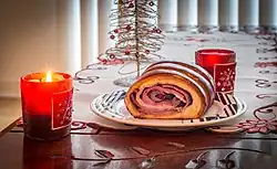 Pan de jamón (ham bread) is a typical Venezuelan Christmas bread, filled with ham, raisins and green olives.[1] Many variations have been created, some filling the bread with other ingredients like turkey or cream cheese and others using puff pastry as the dough. Pan de jamón appeared in the beginning of the 20th century and slowly became a tradition in the Christmas season in Venezuela and Madeira.
