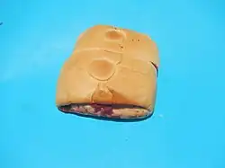 Most of the names of the bread are deliberately humorous and vulgar.[1] Its most common name, pan de regla, translates to "menstrual bread" due to its color and appearance. This is also referenced in other local names like alembong ("flirty"), bellas ("beautiful [women]"), ligaya ("happiness"), and pan de burikat ("prostitute's bread"). Its second most common name, kalihim ("secret"), is because the secret of the bread is that its filling is actually made from the previous day's unsold bread. This is also the source of the name "everlasting bread". Other more descriptive names include pan de pula ("red bread"), lipstick bread, floor wax bread, or kabukiran ("farm [bread]").[1][3][4][5]