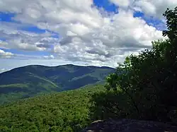 The trail then begins to climb the long ridge of Panther, finally reaching the first (3,480-foot; 1,060 m) of two false summits after 2.7 miles (4.3 km). A short descent follows, then another climb to the second false summit 0.6 miles (0.97 km) to the south. Along the way there is an excellent view of the peaks to the west: Balsam, Fir and Big Indian. It is another 1.2 miles (1.9 km) and a steeper climb to the actual summit.