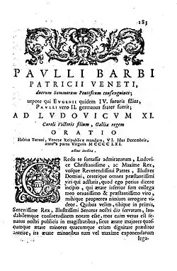The first of these was delivered on 11 January 1452 on the occasion of his embassy to the emperor at Padua. It is preserved in four Italian manuscripts. Barbo implicitly recognizes the universal power of the emperor and ends by paying homage to the empress, Eleanor of Portugal.[7] The second was delivered at Brescia in 1455 when he and Giovanni Moro handed command of the army to the condottiere Bartolomeo Colleoni. Only an excerpt survives and the manuscript labels it an oratiuncula. The third speech was delivered before King Louis XI of France at Tours on 8 December 1461, during his embassy.[2] It was edited by Agostino Valier and published in 1719.[1]