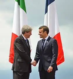 In December 2017, the Gentiloni announced the peacekeeping mission which consists in the sending of 450 soldiers in Niger, to help the local forces in the fight against migrants' traffickers and Islamic terrorism.[87] The deal was reached along with French President Emmanuel Macron, who stated that French troops, which were already in the area, will cooperate with Italian ones.[88][89]