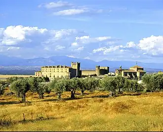 García Álvarez de Toledo's son, Fernán Álvarez de Toledo y Zúñiga, the second lord of Oropesa, with his wife Elvira de Ayala, lady of Cebolla,[6] built the first palace and enlarged the castle at the end of the 14th century.[7] This palace, on the north side of the castle complex and abutting the castle, is a Mudéjar-Gothic building with a long hall room on the upper floor approached from the courtyard by a wide stone interior staircase.[2] The hall was embellished by a polychrome wooden coffered ceiling decorated with the coat of arms of the Álvarez de Toledo family and those of other families connected by marriage. A mirador (lookout point) was built onto the hall, as an internal balcony or loggia open to the air with four foliated Gothic arches. The exterior arch spandrels displayed three coats of arms, one being of the Álvarez family and the other two of the Zúñiga family.[8] Plateresque details were added to the first palace in the 16th century.[2]