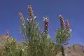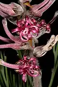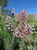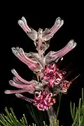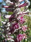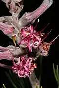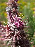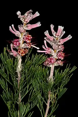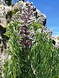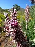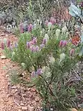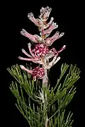 The shrub is monoecious and grows up to 2 m (6.6 ft) tall and flowers from August to October.[3] The leaves are finely divided into acicular segments; they are hairy when they are young. The flowers are arranged in small clusters in veins at the tips of the branches. They are purple-pink and 20–25 mm (0.79–0.98 in) long. Fire destroys the plant but the seeds survive. The plant is bisexual and pollinated by insects. The fruit ripens two months after the plant has flowered and the seeds fall to the ground where they are spread by ants.[3]