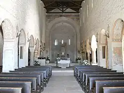 The floor is covered with light-colored limestone tiles. In front of the entrance, also on the floor, is a circular slab (2.60 m in diameter) that indicated, according to one hypothesis, the spot where there was the seat of a public official, while according to another theory, it was the place where the baptismal font (now located in the left aisle) was placed.[19] This one (of the immersion type) is made of local stone and is octagonal in shape; at one time it must have also had a bronze lid.