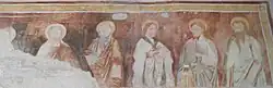 The frescoes preserved here, although somewhat deteriorated, represent an interesting example of painting dated to the 11th century.[note 11] In the western apse is, placed in the semi-catin, a Christ Judge with a red cloak over his shoulder and surrounded by symbols of the evangelists. Three seraphim can be seen under the lap of the apse, while on the walls next to the apse area are depicted, on the right, a bearded saint wearing a short tunic streaked with green, and on the left a more youthful-looking soldier saint wearing a chlamys trimmed with gems.[9]