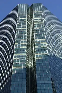 The base of the tower is the same height as the Racquet and Tennis Club Building's cornice line.[14] The main entrances are through revolving doors on 52nd and 53rd Streets.[11][14] The facade is made of blue-green reflective panels of glass, alternating with silver mullions.[14] SOM had chosen that color because they had wanted the facade to blend in with those of neighboring buildings, although the color contrasted with the tan-brick facade of the Racquet and Tennis Club Building. At the time of Park Avenue Plaza's completion, Lever House (also designed by SOM) was the only other nearby building with a blue-green glass facade.[8][9] The facade contained a lightly glazed finish, which reflected heat during the summer.[11]