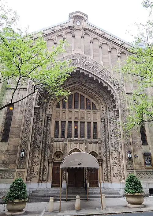 The congregation was founded in 1882 as the Reform congregation, "Temple Gates of Hope", by a group of German Jews.[2] After several mergers, the congregation took the Hebrew name "Agudat Yesharim", and later petitioned the state of New York to change the official name of the congregation to "Park Avenue Synagogue" in 1923. In 1927, the present Moorish-style building on East 87th Street was constructed.[3] By the 1930s, the congregation changed its affiliation from Reform Judaism to Conservative in order to accommodate the merger of the congregation with several other congregations containing large numbers of Eastern European Jews.