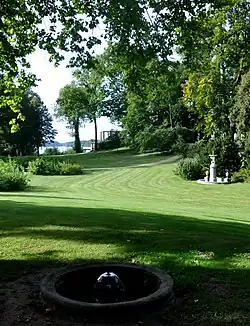 Elliptical and round flower beds with terracotta palmette borders are typical for garden courtyard and pleasure ground. The restoration was supported by discovering original border stones in the cellar of the Curiosity pavilion.[12] In the underground the beds are walled in allowing for specific irrigation, therefore the pleasure ground has been crisscrossed with water pipes. As the clay pipes on Peacock Island lasted only ten years after being installed in 1824 expensive iron pipes supplied by the Prussian industrial pioneer F.A. Egells (de) were installed in Glienicke when in 1838 the pumping station started operating with a steam engine, a gift by Charles’ father which was also manufactured by F.A. Egells.[5]: 202 The beds were filled with a loose subsoil which facilitated the quick replacement of plants. There are some figurative designed beds bordered with buxus which add to the pleasure ground an artificial aspect, e.g. the Oak Leaf bed near the Lions Fountain and the Diana(Greek:Artemis) or Pliny bed at the Casino. An Athena statue, which is now at the British Museum, stood in a niche on the northside of the Casino characterizing it as a place of art. Most striking is the Lilies bed beneath Charles' bedroom windows at the western facade of the palace. It is a heraldic sign referring to Charles' younger sister Louise who was married to Prince Frederick of the Netherlands. She was very supportive sending bulbs to Charles. In Glienicke planting of roses has been almost non-existent in contrast to Babelsberg Park and Peacock Island. The pleasure ground in Glienicke is rather a portrayal of an antique villa complex as described by Pliny the Younger than a reflexion on a longing for Italy(Italiensehnsucht).