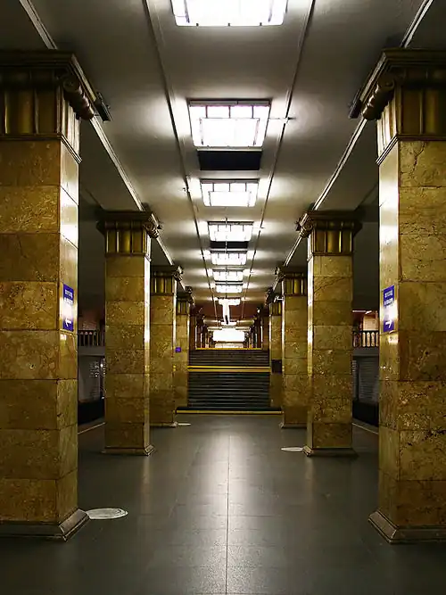 The station is a bi-level pillar-trispan with four footbridges above the platforms. Architects Krutikov and Popov chose a decoration inspired by ancient Greek elements. Along the platform, two rows of 22 pillars are faced with Crimean marble Kadykovka and topped with moulded сapitals. Along the walls a set of dark rose-coloured mosaic pilasters repeat the step of the pillars (every seven metres), blending very well with the porcelain tiles that face the rest of the wall area. Also, a dark-brown mosaic socle runs below the platform level along both walls. A total of 1500 square meters of marble, and 200 square metres of porcelain tiles, were used in the decorations.