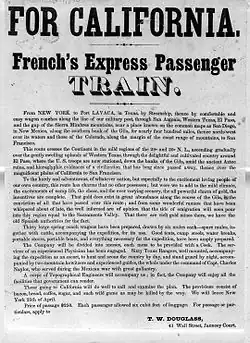 17. ^ While he was in St. Louis in 1849 the Pioneer Line was offering a paid expedition to California for a fee $200. The company claimed it would get enrollees there within 60 days. Clearly, French copied that proposal. Expeditioners of the Pioneer Line suffered greatly. See Gordon, Mary McDougall, ed. Overland to California with the Pioneer Line: The Gold Rush Diary of Bernard J. Reid, Stanford Univ. Press: 1981.