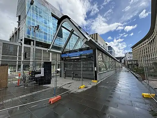 There are four entrances, two serving the University of Melbourne, one outside the Royal Melbourne Hospital, and the other in front of the Peter MacCallum Cancer Centre.[8] An underground walkway connects the entrances and four sets of lifts underneath Royal Parade, while the main station concourse lies beneath Grattan Street.[8] The main entrance features a 50-metre-long steel and glass canopy, and a number of skylights provide natural light to the station concourse, which is clad on one side with green aluminium.[8] Like other Metro Tunnel stations, exposed concrete is a key design element.[8]