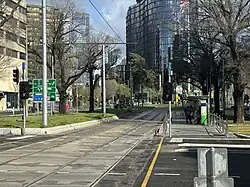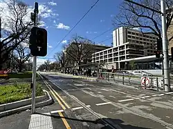 New Royal Parade tram stop, looking south towards Haymarket roundabout, January 2024 -