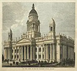 Painting of the original Parliament House design. The towers and domes were not included in the final design much like the proposed dome for Melbourne's Parliament House.