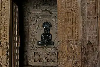 The ceiling of the entrance porch features chain and floral patterns, and a pair of intertwined flying vidyadharas. The door-lintel of the mandapa has the sculpture of Adinatha's attendant: a ten-armed Chakreshvari riding a Garuda. The sanctum features sculptures of the Jinas.[6][7]