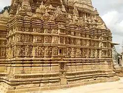 The outer walls have three bands of sculptures.[6] These sculptures feature surasundaris (graceful women), flying couples, dancers, musicians, and celestial beings.[7] Despite the temple's Jain affiliation, the outer walls also depict Vaishnavite themes including sculptures of Hindu gods and their incarnations with their consorts. These include Vishnu-Lakshmi, Rama-Sita, Balarama-Revati, Parashurama, Hanuman, Brahma and Yamalarjuna legend of Krishna. These sculptures are similar to those of the Lakshmana Temple in modeling, proportions and poise.[7][6] Unlike the Lakshmana temple, the Parshvanatha temple doesn't feature explicit erotic sculptures, although one particular image appears to show a cross-legged apsara masturbating with an object.[7]