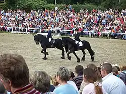 A pas de deux is an equestrian performance[1] using two horses. The horses perform dressage movements, usually mirroring each other, and almost always accompanied by music. Pas de deux are often performed in exhibitions at special events, and are also used by professional acts, particularly the Spanish Riding School.